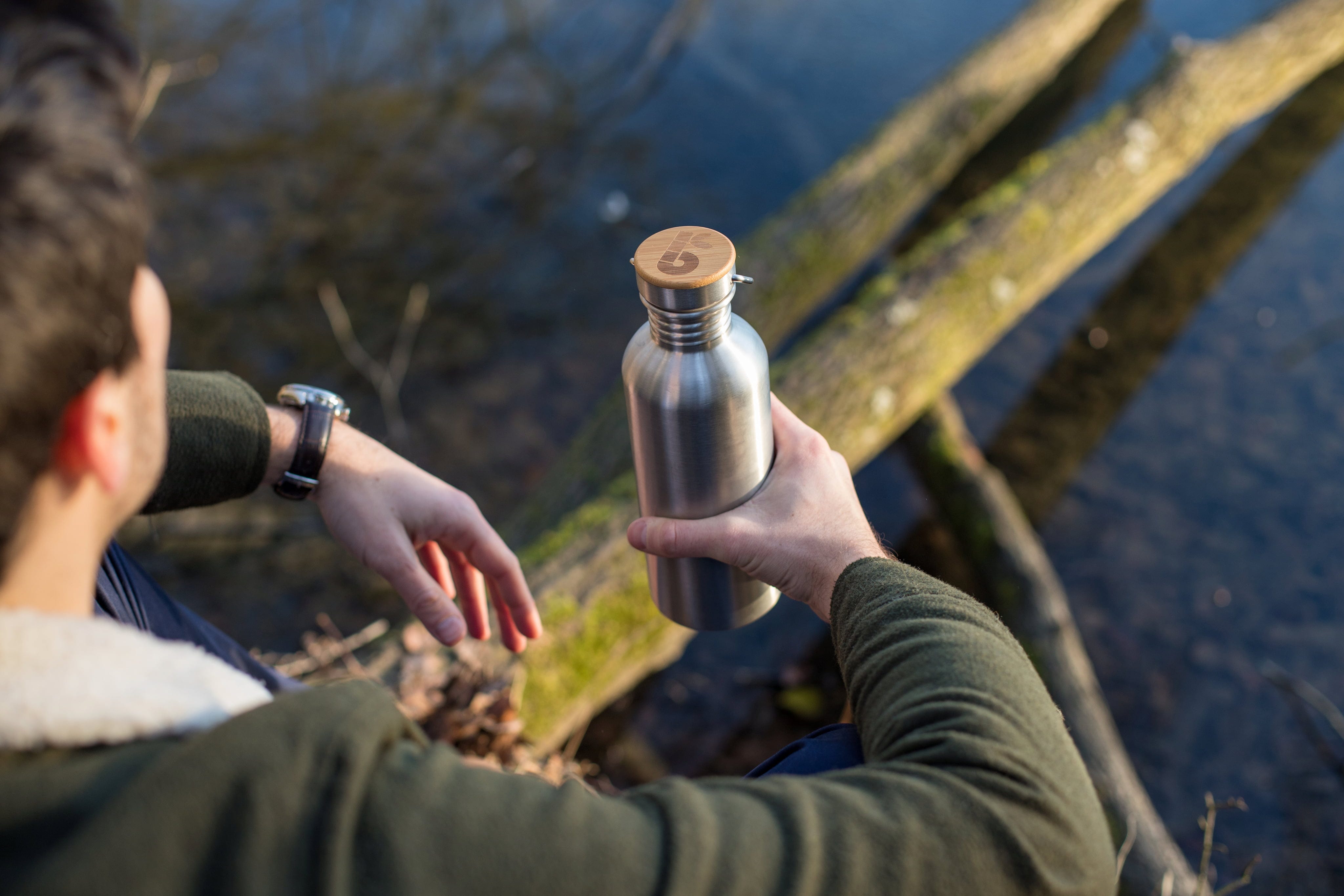 Deze fles is perfect voor je dagelijks leven! Bij het sporten, op kantoor, op school of tijdens het wandelen. Hij is gemaakt van roestvrij staal, heeft een lekvrije schroefdop van bamboe en heeft een tijdloos en eenvoudig ontwerp. De fles is vrij van schadelijke chemicaliën en kan na gebruik eenvoudig worden gereinigd met een flessenborstel.