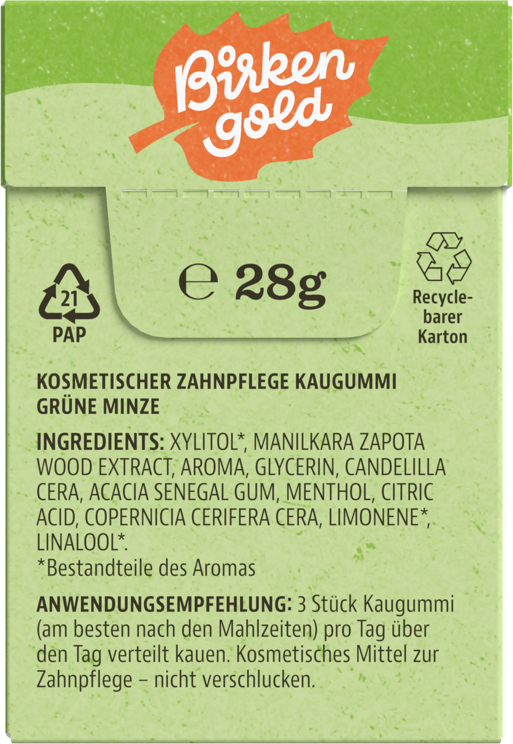 Birkengold® kauwgom bevat Europese xylitol, gemaakt van berken- en beukenbast. De kauwgom wordt gemaakt van het sap van de sapotilla boom en candelillawas. Het recept is gemaakt van 100% hernieuwbare grondstoffen en bevat geen kunstmatige zoetstoffen zoals aspartaam.