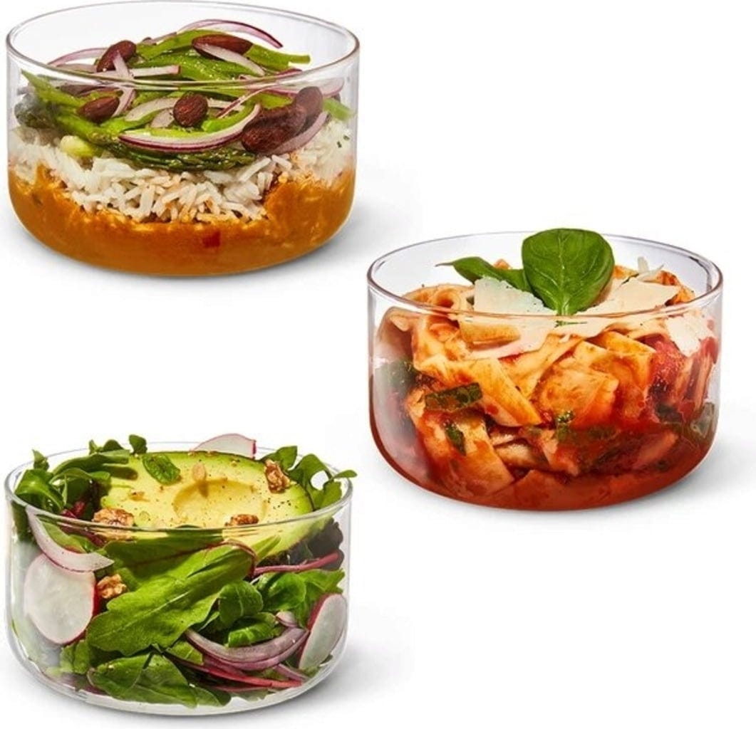 Geschikt voor de magnetron, behalve de roestvrijstalen deksel. Til hiervoor de siliconen deksel iets op en duw het lipje in de rand van de glazen schaal. Dit creëert een kleine opening en zorgt ervoor dat de deksel niet in de schaal wordt gezogen tijdens het opwarmen. De bodem van houtvezel wordt niet heet en maakt het makkelijker om hem uit het apparaat te halen.