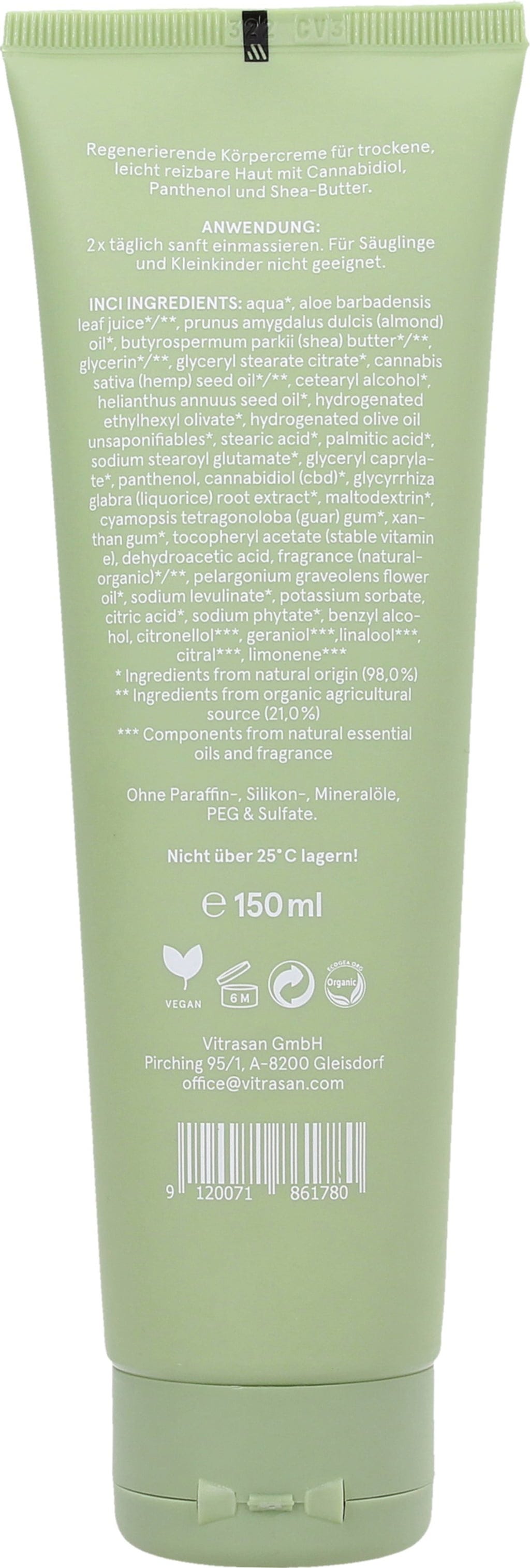 Aqua[1], Aloe Barbadensis Leaf Juice[2], Prunus Amygdalus (Sweet Almond) Oil[1], Butyrospermum Parkii (Shea) Butter[2], Glycerin[2], Glyceryl Stearat Citrat[1], Cannabis Sativa (Hemp) Seed Oil[2], Cetearylalcohol[1], Helianthus Annus (Sunflower) Seed Oil[1], Hydrogenated Ethylhexyl Olivate[1], Hydrogenated Olive Oil Unsaponifiables[1], Stearic Acid[1], Palmitic Acid[1], Sodium Stearoyl Glutamate[1], Glyceryl Caprylate[1], Panthenol, Cannabidiol (Cbd), Glycyrrhiza Glabra (Licorice) Root Extract[1], Maltodextrin[1], Cyamopsis Tetragonoloba (Guar) Gum[1], Xanthan Gum[1], Tocopherylacetat, Dehydroacetic Acid, Fragrance[2], Pelargonium Graveolens (Rose Geranium) Oil[1], Sodium Levulinate[1], Potassium Sorbate, Citric Acid, Sodium Phytate[1], Benzyl Alcohol, Citronellal[3], Geraniol[3], Linalool[3], Citral[3], Limonene[3]