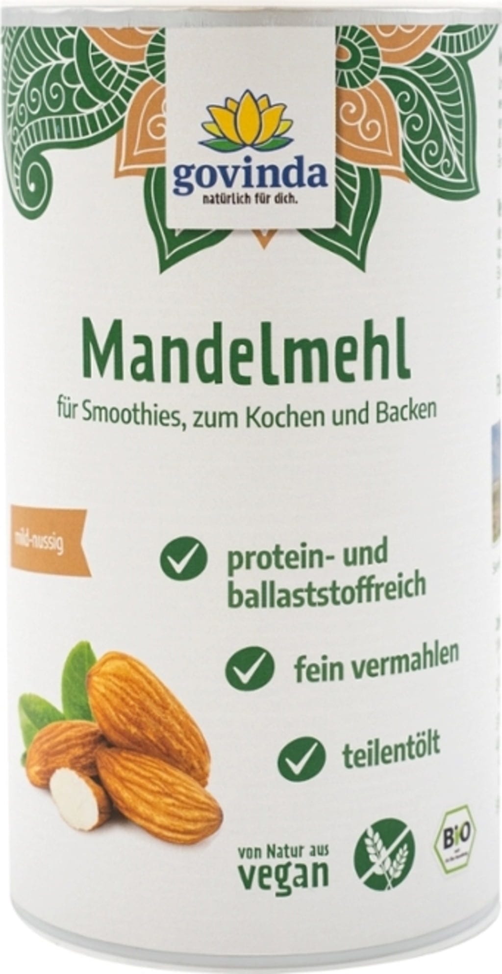 Biologisch amandelmeel wordt verkregen uit de rijpe vrucht van de amandelboom door koude persing. De perskoek (de basis van amandelmeel) wordt nu gedeeltelijk ontvet en fijngemalen. Alleen geselecteerde zoete amandelen worden gebruikt in de productie van Govinda biologisch amandelmeel.