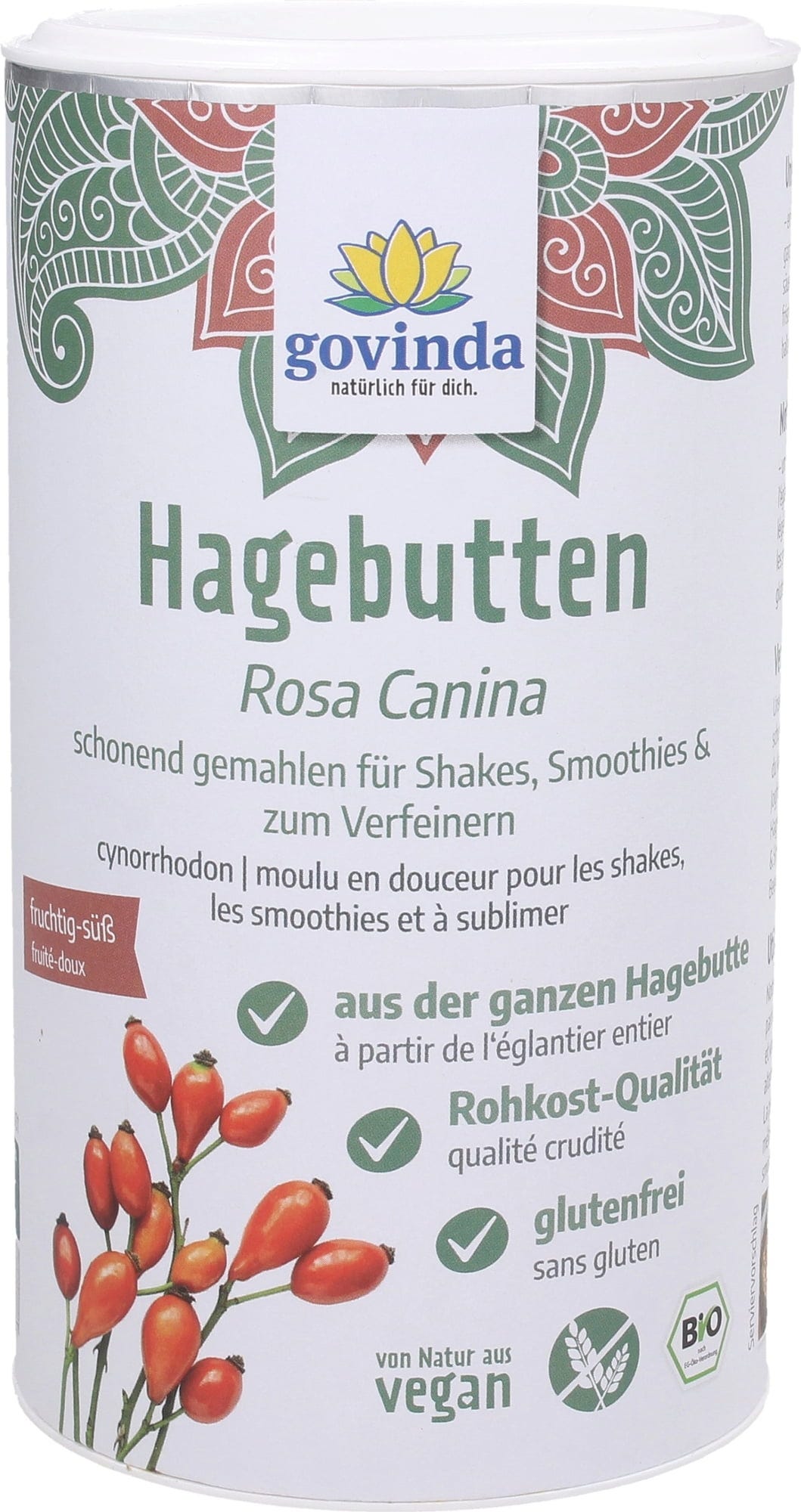 Houd jij van fruitig en krachtig ontbijten? Het biologische rozenbottelpoeder van Govinda verfijnt shakes, muesli en dergelijke in een handomdraai en geeft ze een fruitige, zure noot. Het poeder is ook ideaal als bakingrediënt of als alternatieve zoetstof. Hele rozenbottels, inclusief ontvette zaden, worden gebruikt in het productieproces.