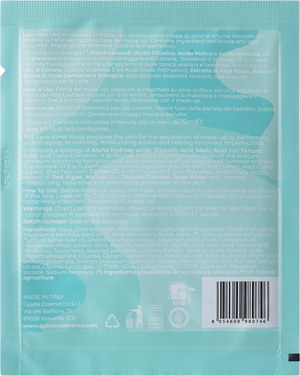 Dit tissuemasker biedt 4-in-1 verzorging die primer, hydratatie, anti-aging en verstevigende eigenschappen combineert. Een synergie van AHA (glycolzuur, appelzuur en wijnsteenzuur) en sporenelementen zorgt voor een lichte peeling die de hydratatie verbetert en de celvernieuwing bevordert. De regeneratie van de bovenste huidlagen zorgen voor een sterkere, meer elastische en stralende huid. Verrijkt met katoenolie, rode algen, kaasjeskruid en rozenwater, zorgt de formulering voor optimale hydratatie en nieuwe elasticiteit.
