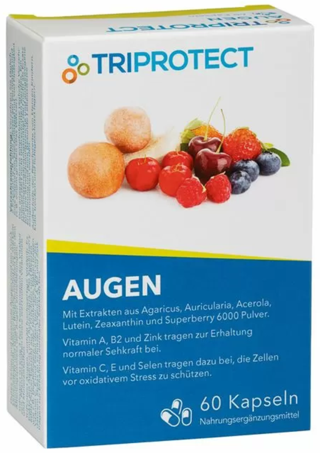 - Met luteïne, zeaxanthine, extracten van Agaricus, Auricularia, Acerola en bosbes.