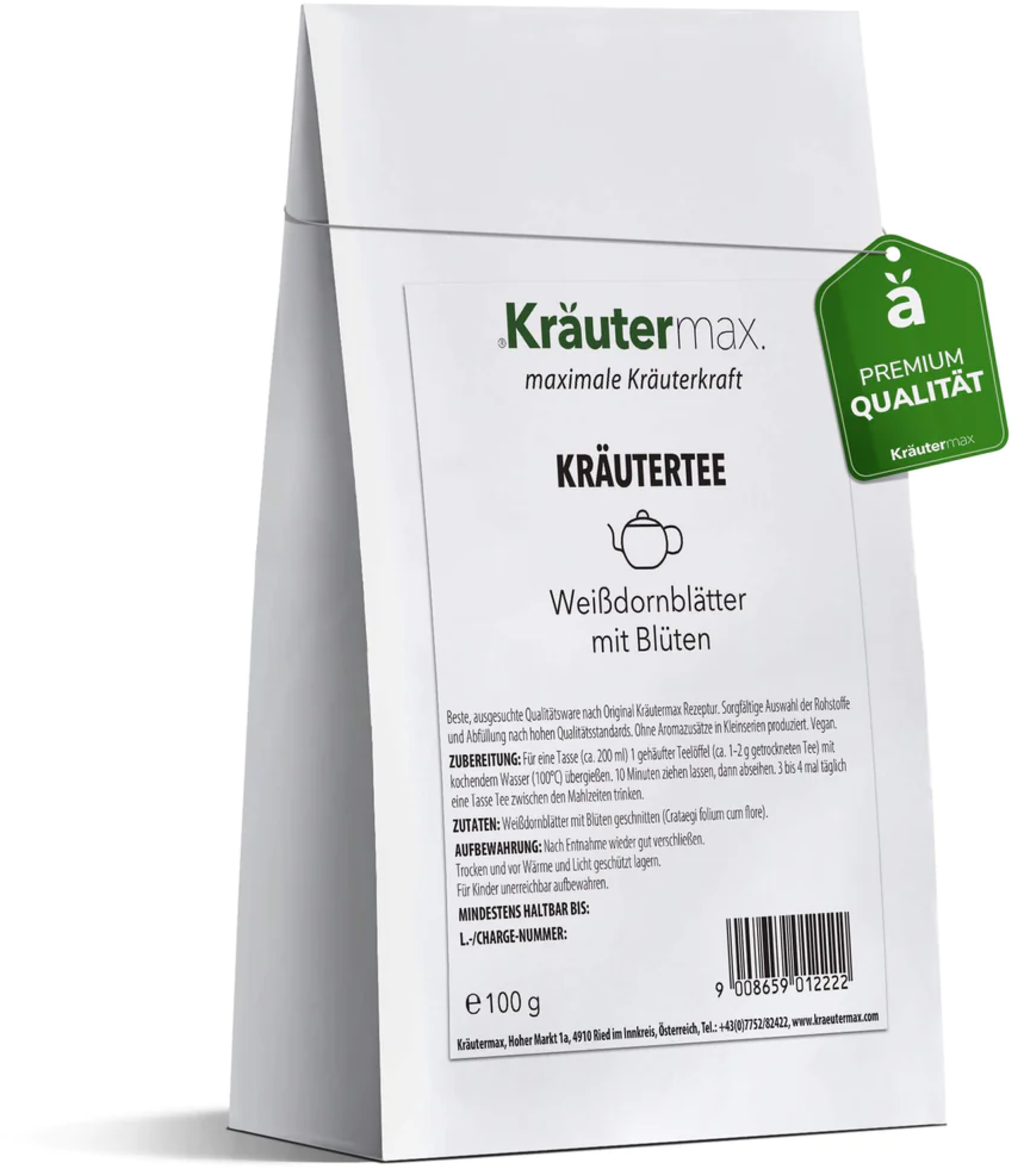 De Kruidenthee Meidoornbladeren met Bloesems van Kräutermax wordt gesneden en geproduceerd onder hoge kwaliteitsnormen.