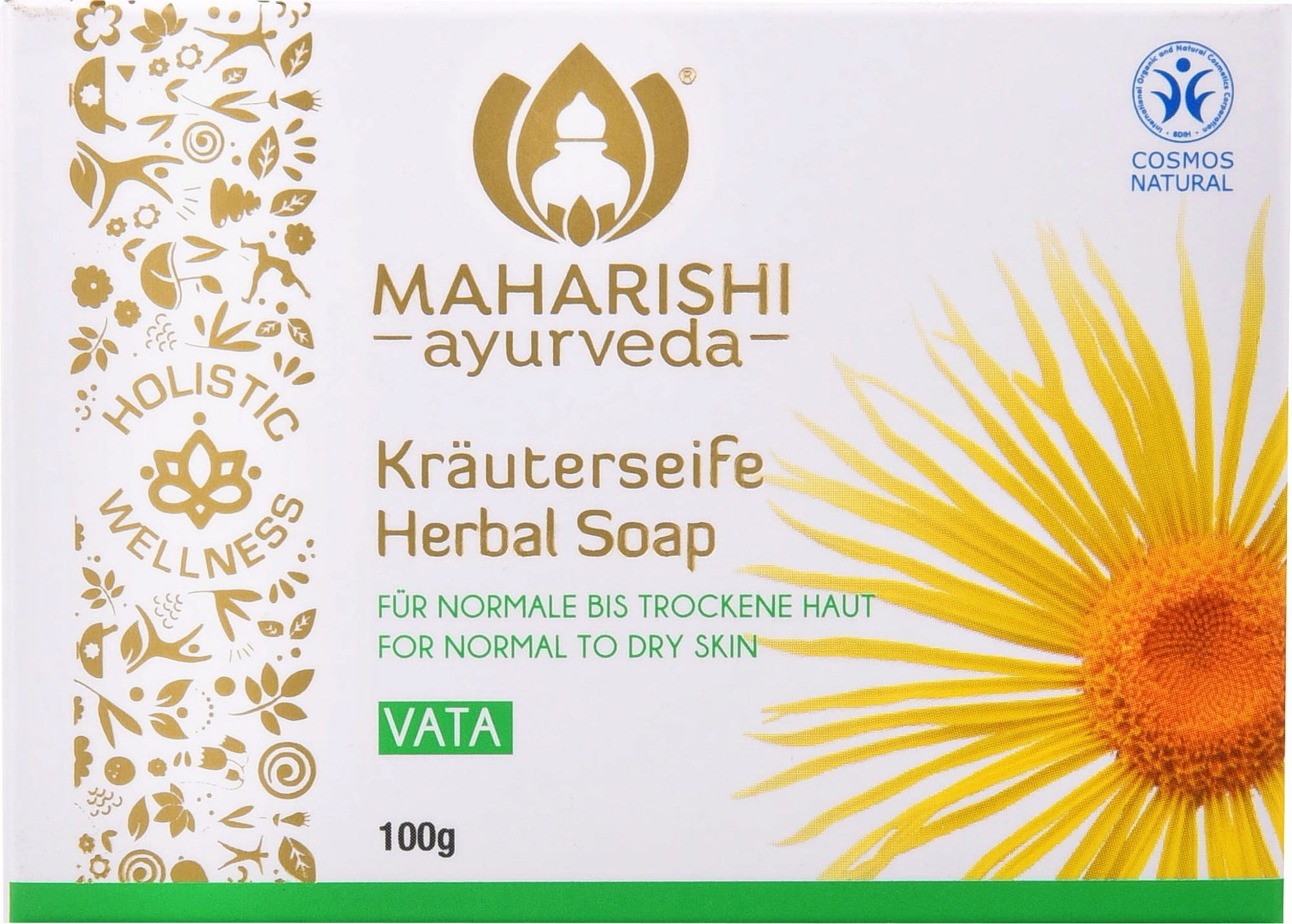 De Maharishi Ayurveda Vata Kruidenzeep is gemaakt op puur plantaardige basis - met natuurlijke oliën en geurige essences. Met een hoog aandeel Ayurvedische kruiden, waaronder kurkuma, en de geur van 100% natuurzuivere citroengras aromaolie. Voor de normale tot droge huid.