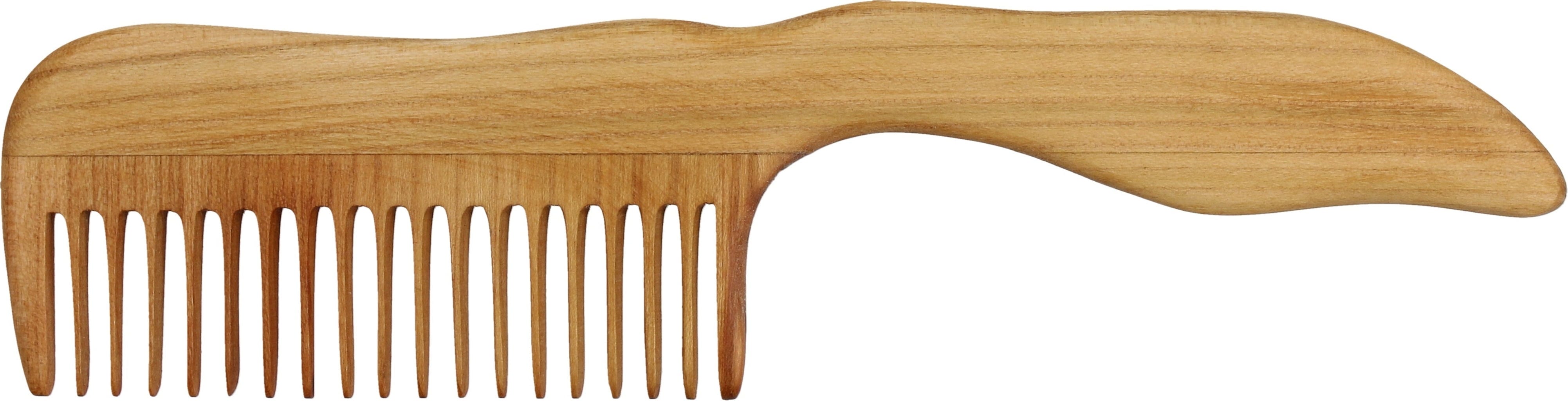 In het geval van de houten kam liggen de tanden iets verder uit elkaar, zodat zelfs dik of lang haar zonder problemen kan worden gekamd. Het is verkrijgbaar in twee prachtige houtvarianten.