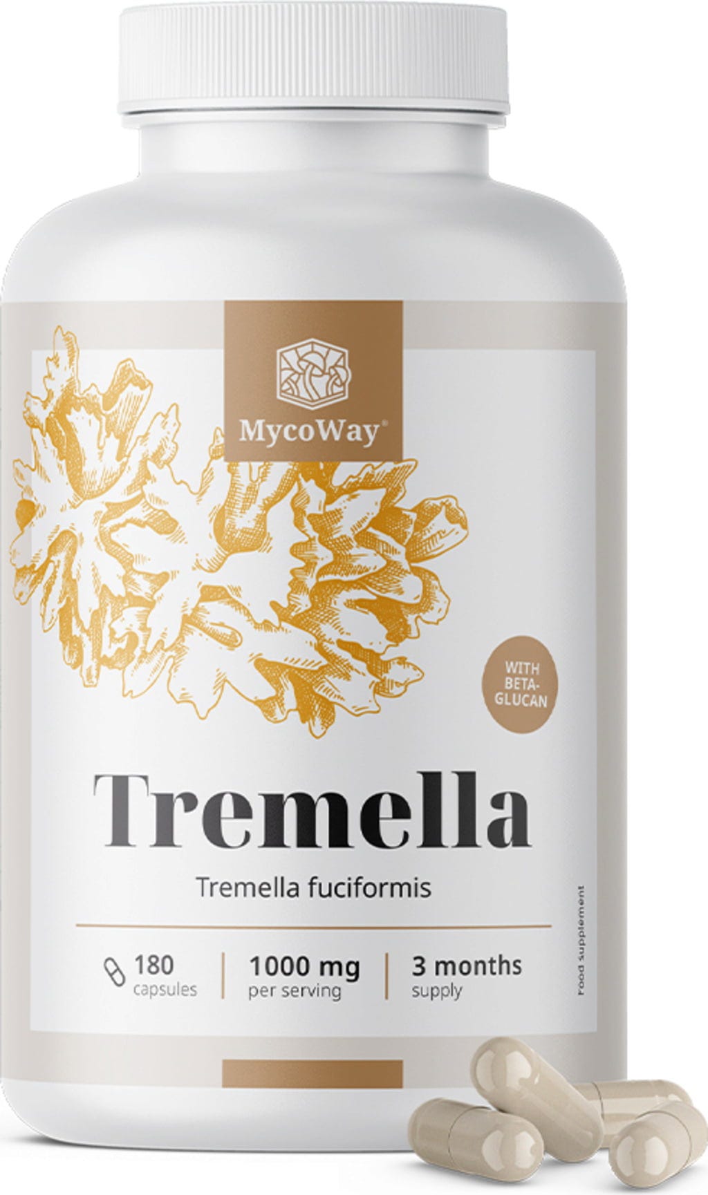De Tremella-capsules van MycoWay bevatten zorgvuldig gedroogde en fijnvermalen Tremella, die voornamelijk in tropische en subtropische gebieden groeit. Vanwege de sterk hydraterende eigenschappen wordt Tremella veelvuldig gebruikt in cosmetica voor huid en haar. Bovendien is deze paddenstoel rijk aan bètaglucanen.