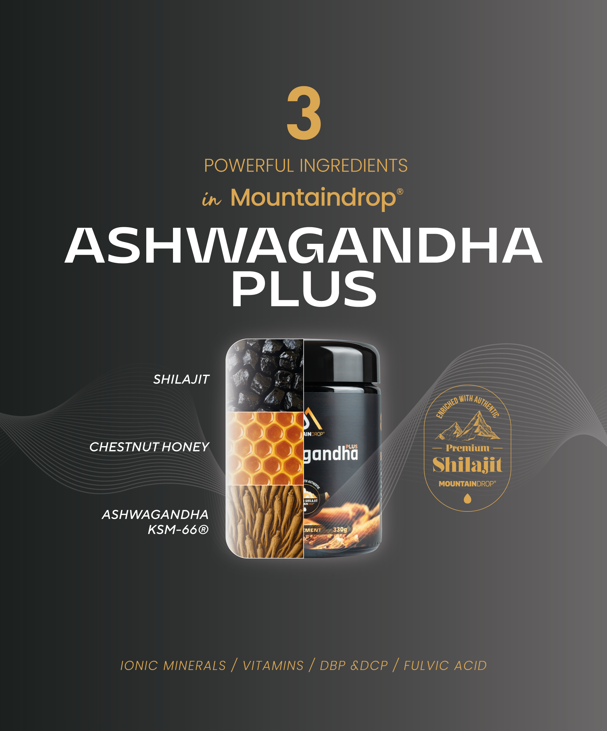 shilajit-hars, KSM-66® ashwagandha-wortelextract, Kastanjehoning