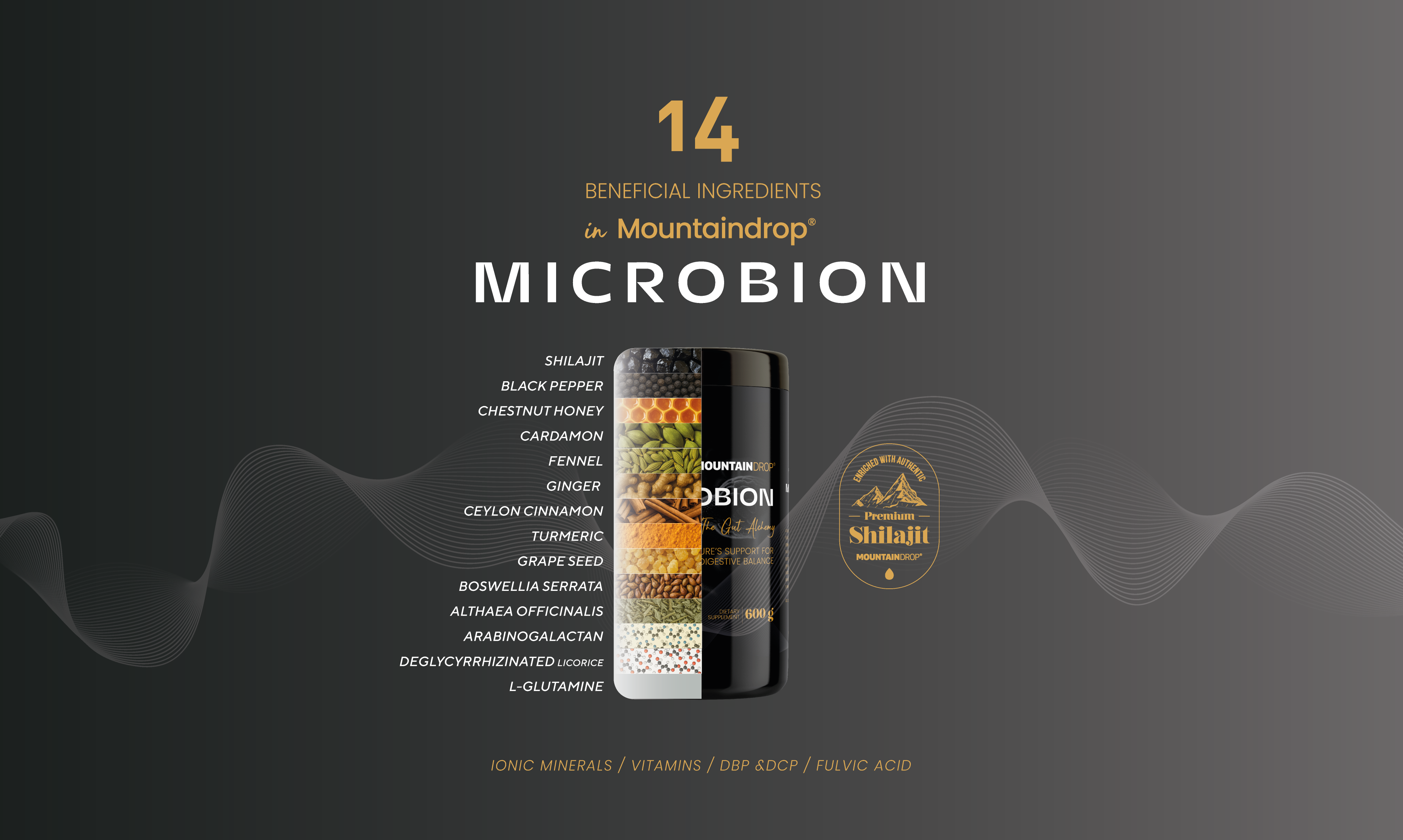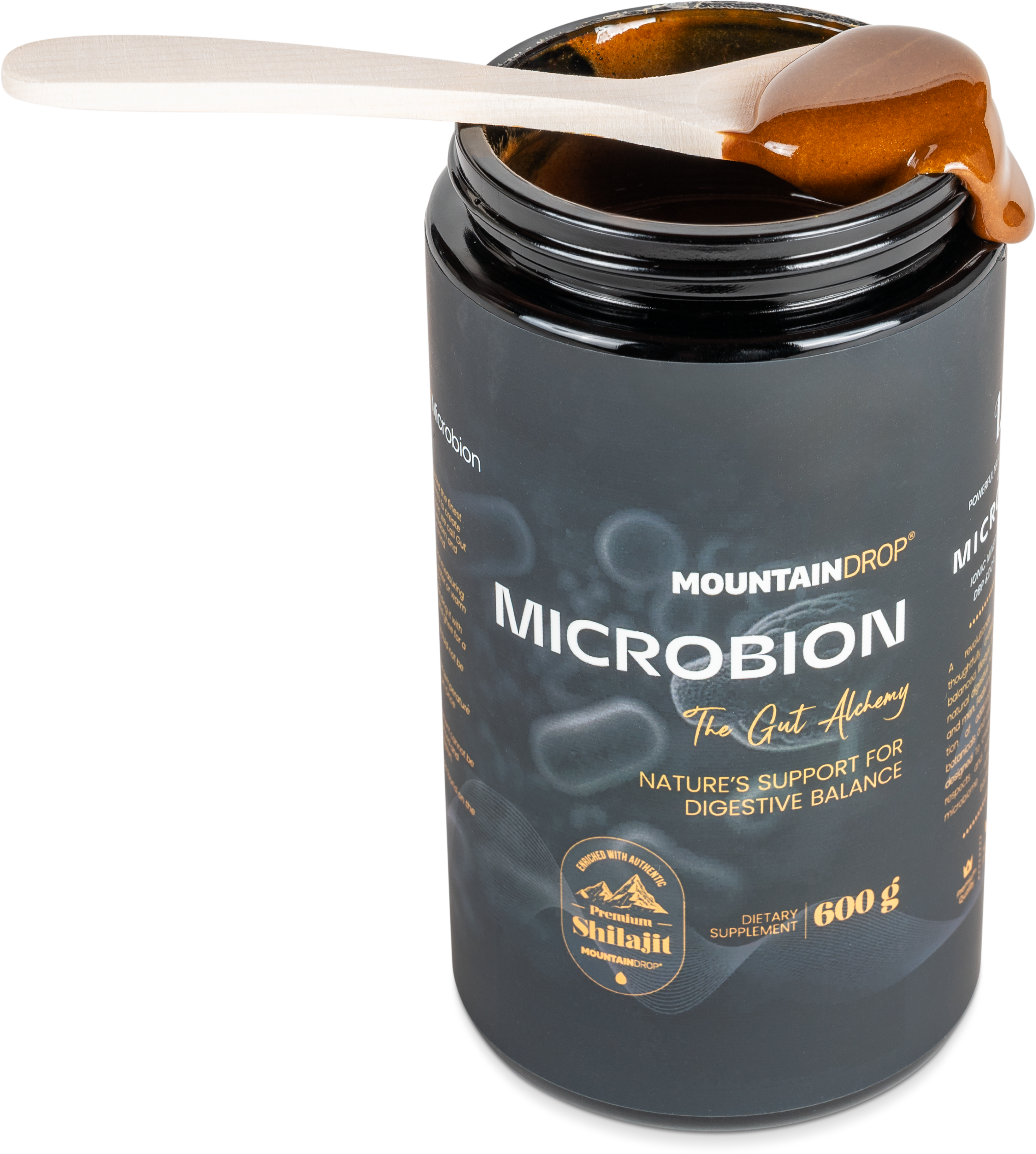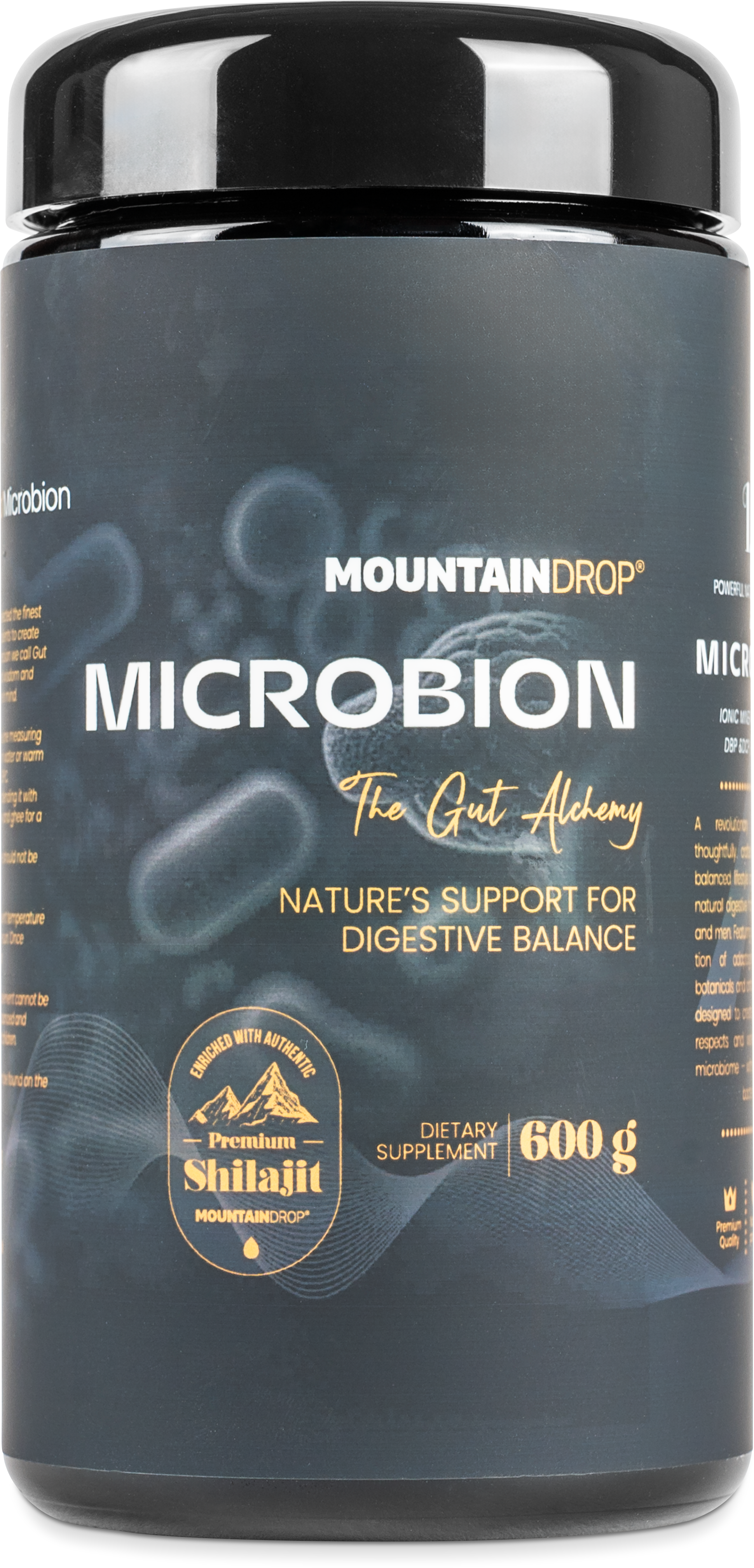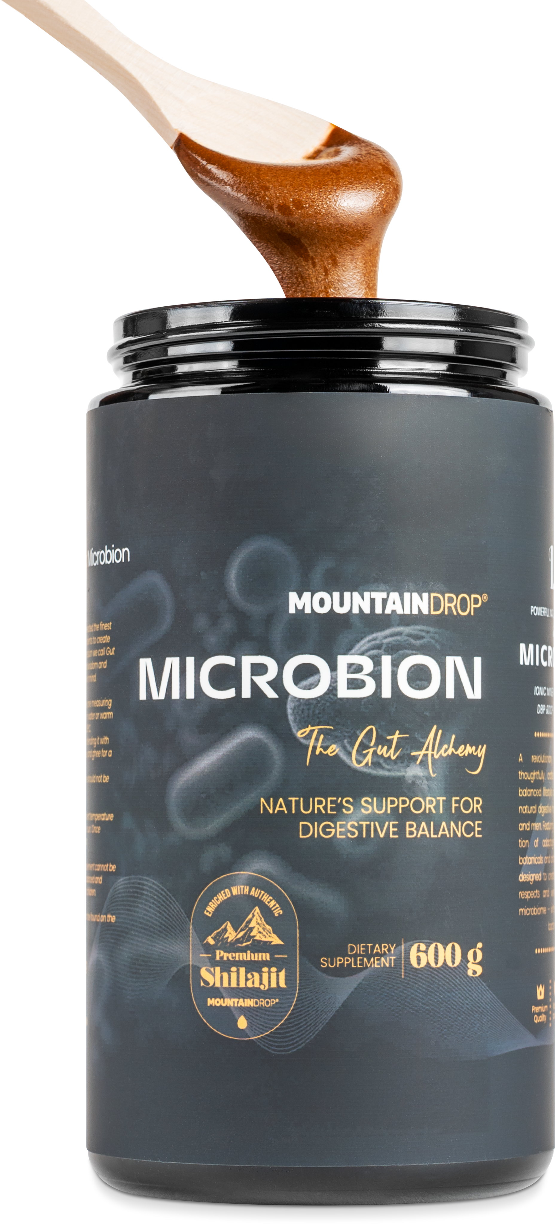 Microbion van Mountaindrop verenigt premium Shilajit met een selectie van 13 botanische componenten in een basis van natuurzuivere honing. De receptuur vertrouwt op een fijn afgestemde matrix van prebiotisch arabinogalactaan en het aminozuur L-glutamine, aangevuld met traditioneel gewaardeerde extracten van kurkuma, boswellia (wierook) en gember. Botanische ingrediënten zoals heemstwortel en DGL-zoethout ronden het profiel af, samen met druivenpitextract. Door de behoedzame koude verwerking in Slovenië blijven de natuurlijke structuren van de harsen en kruiden behouden, terwijl zwarte peper de biologische beschikbaarheid optimaliseert.