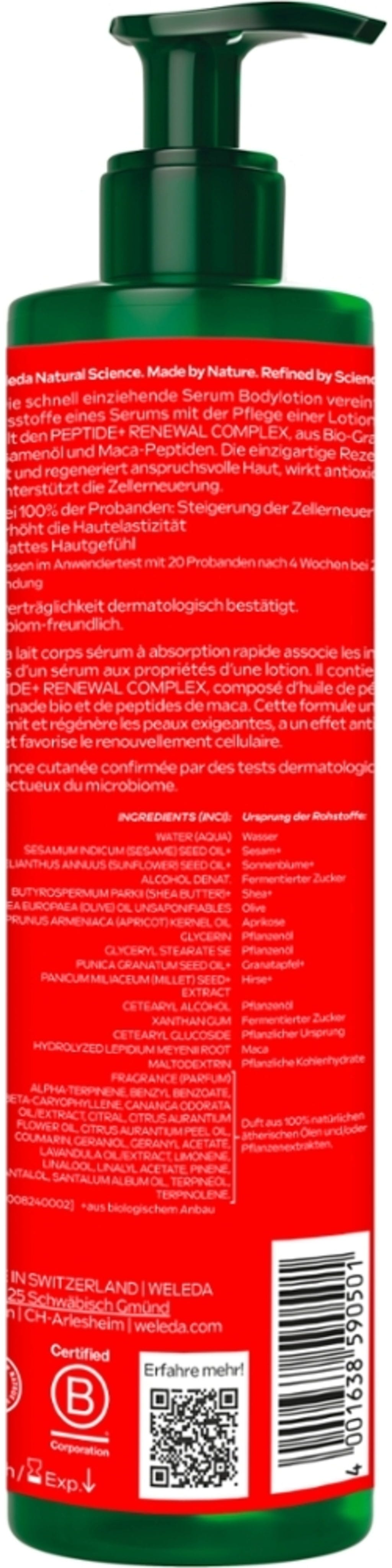 Deze speciale body lotion combineert de formule van een serum met de textuur van een lotion. De formule bevat Weleda's PEPTIDE+ RENEWAL COMPLEX met maca-peptiden en olie van biologische granaatappelpitten. De lotion biedt daardoor verstevigende en gladmakende eigenschappen en ondersteunt de elasticiteit van de huid.
