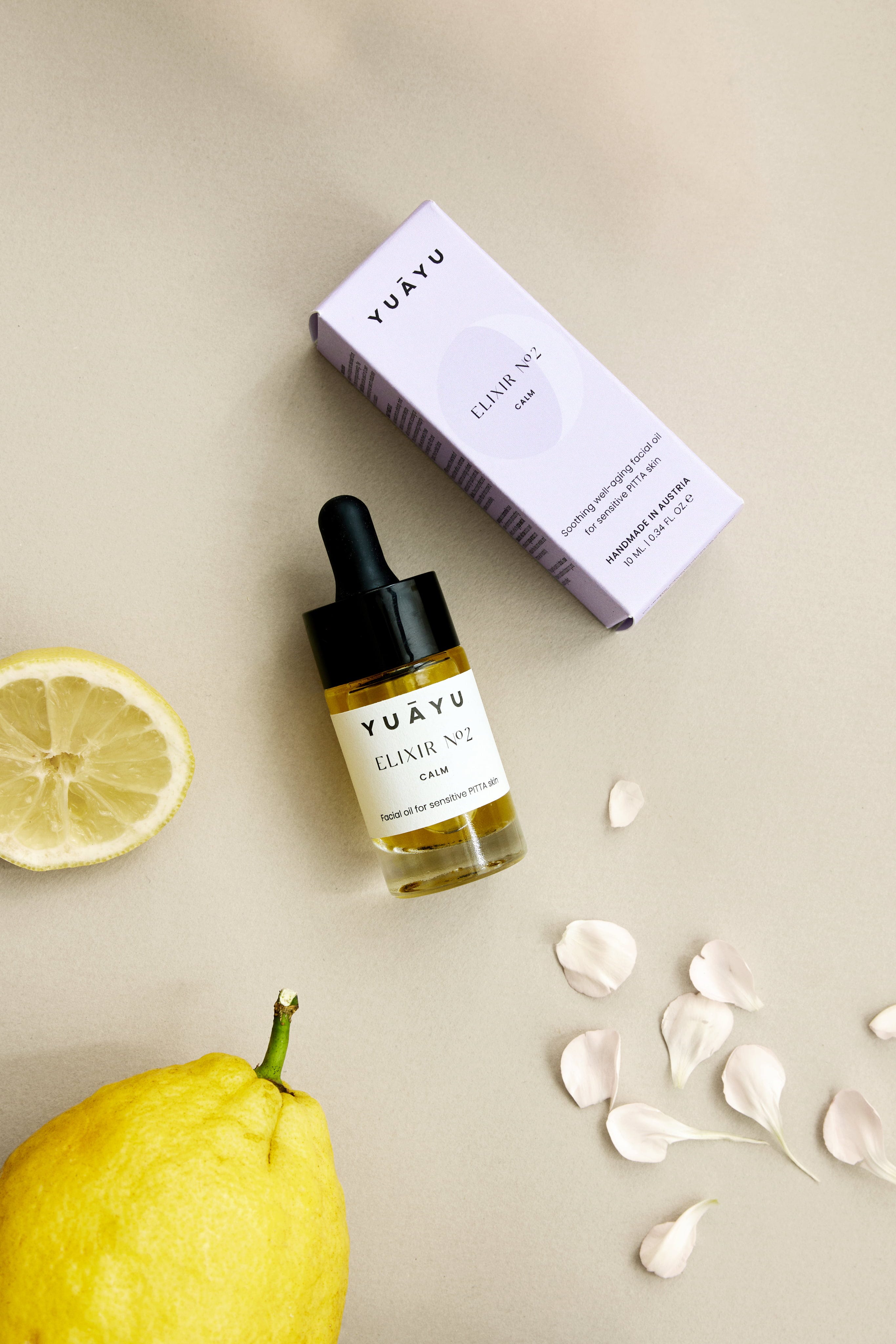 Elixer No. 2 van YUĀYU is een Ayurvedisch geïnspireerde gezichtsolie met een uitgebalanceerde mix van verzorgende plantaardige oliën, specifiek afgestemd op de gevoelige huid en de gecombineerde huid. Ingrediënten zoals goudsbloem- en kamille-extracten, druivenpit- en rozenbottelolie, evenals 1% bakuchiol en een waardevol algenextract, verzorgen jouw Pitta-huid op ideale wijze. De formule ondersteunt de vochtbalans en laat een aangenaam soepel huidgevoel achter. De subtiele geur van citroen en roos verwent bovendien jouw zintuigen en brengt de geest tot rust.